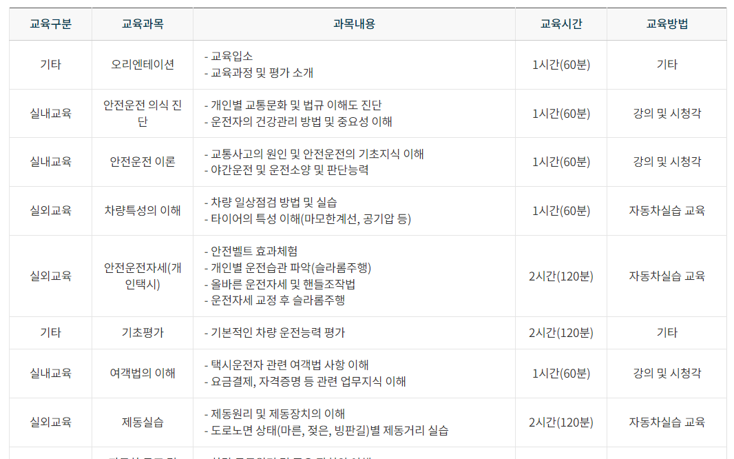 아래는 개인택시 양수교육 과목인데요, 강의라던지 시청각 자료등을 그냥 습득하는 교육만 있는것이 아니라 실제로 자동차 실습 교육도 이루어집니다.