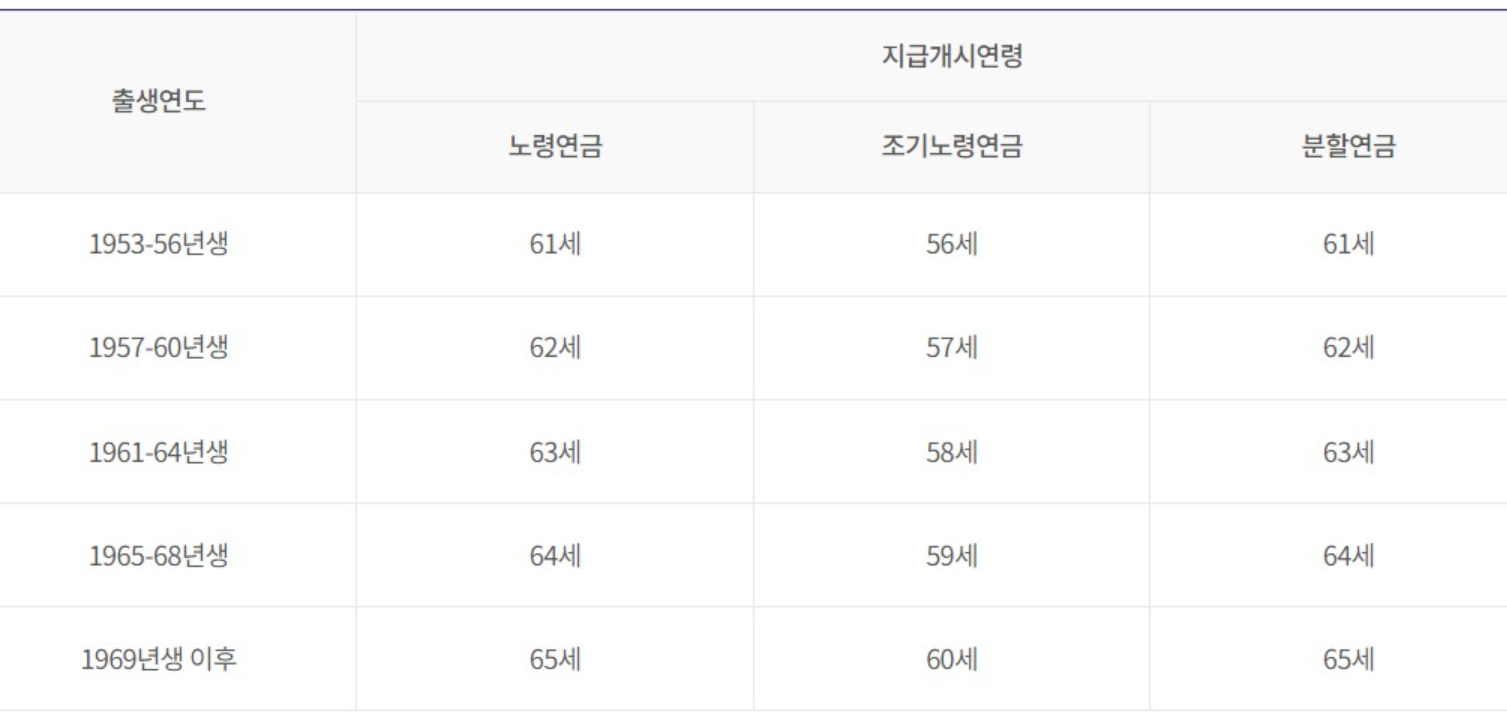 아래 표에서 내 생년월일에 따라 국민연금 수령시기가 언제쯤 되는지 확인해보시기 바랍니다.