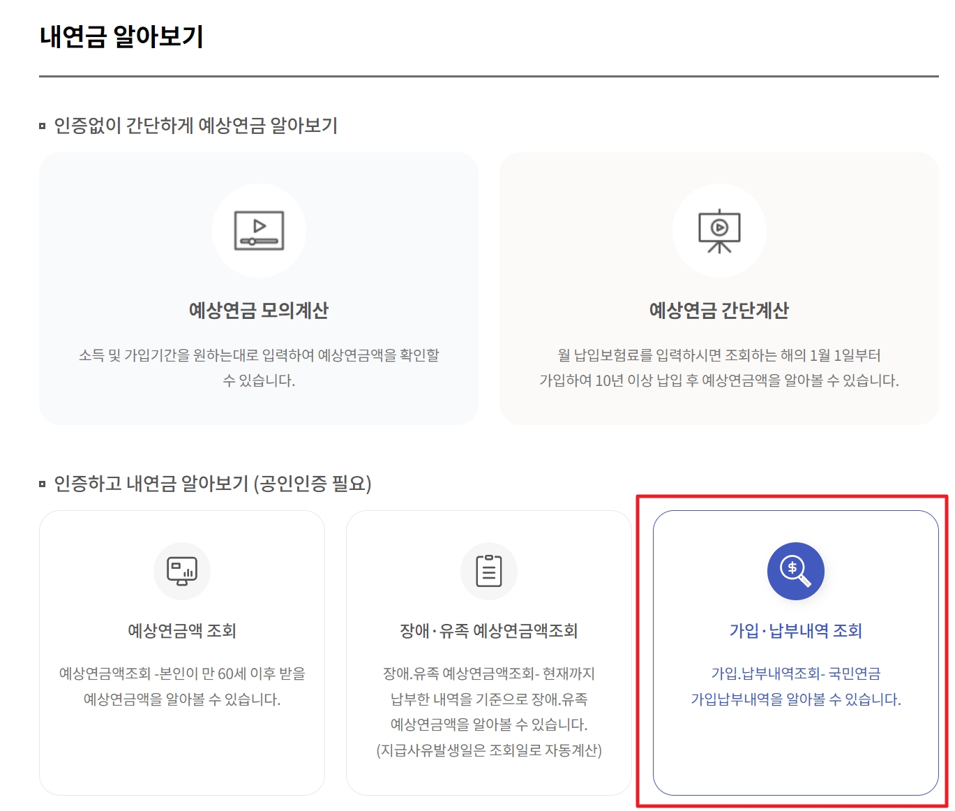 위 버튼을 클릭하시면 아래와 같은 페이지로 바로 이동합니다. 국민연금 납부내역은 아래 빨간색 색인되어있는 영역을 클릭하시면 간편하게 확인할 수 있습니다.