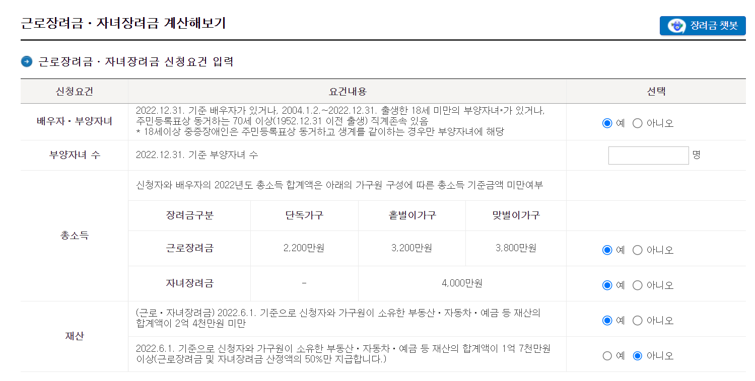 위 버튼을 클릭하면 로그인 없이도 근로장려금과 자녀장려금을 계산해 볼 수 있는 페이지로 넘어갑니다. 해당 서비스에서 내 요건 내용에 맞게 체크하여 신청 자격에 부합한지 조회해 볼 수 있습니다.