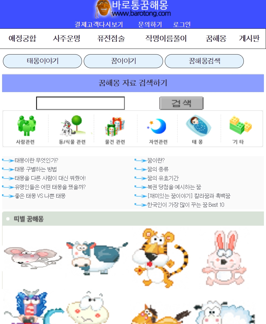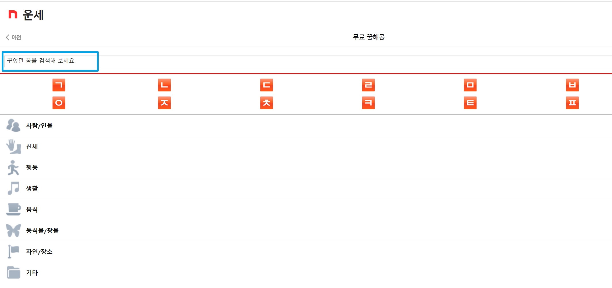 네이트에서 제공하는 꿈해몽 풀이서비스는 카테고리 별로 클릭하거나 검색을 통해 찾아볼 수 있습니다.