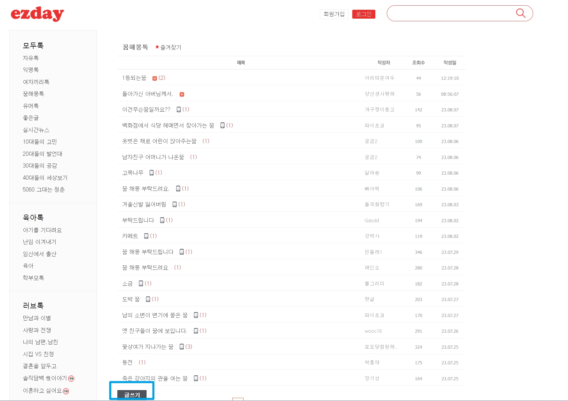 해당 커뮤니티는 말씀드리는대로 여성전용 사이트입니다. 해당 사이트에 로그인 후 글쓰기를 클릭하시어 내가 오늘 꿈꿨던 내용을 기입해볼 수 있습니다.