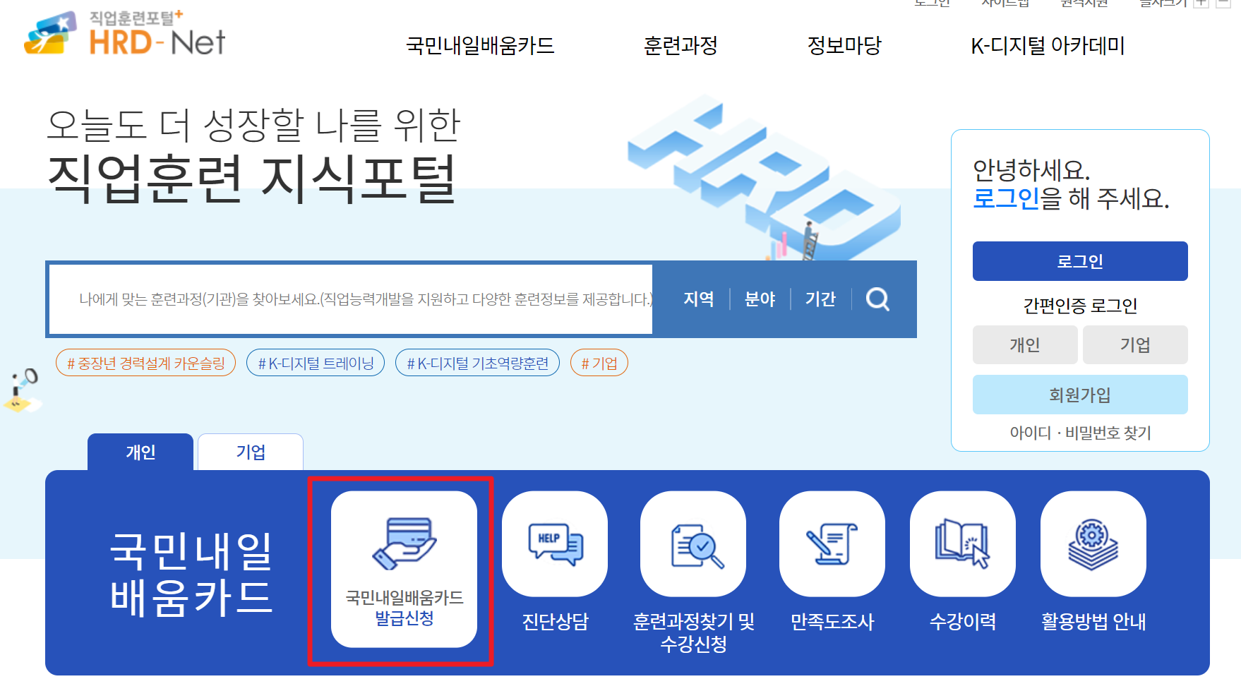 해당 페이지에서 빨간색 박스를 클릭 후 국민내일 배움카드를 발급 신청해보시기 바랍니다.