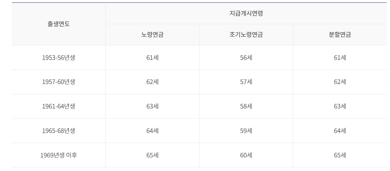 위에서 말씀드린 것처럼 출생연도에 따라 노령연금 개시 연령이 다릅니다. 내 출생연도에 맞는 개시연령을 확인해 보도록 합니다.