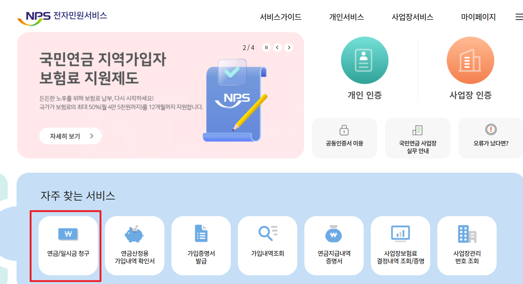 해당 버튼 클릭 시 아래 빨간색 영역 박스를 클릭하시면 개인인증 후 연금을 신청할 수 있습니다.