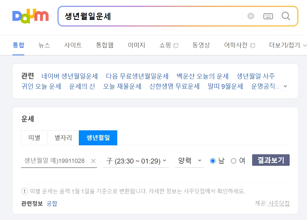 다음 무료운세는 검색을 할 경우 바로 확인할 수 있습니다. 해당 운세는 띠별, 별자리, 생년월일로 구분하여 확인해볼 수 있는데요 만약 생년월일로 사주풀이를 확인하고 싶을 경우에는 음력과 양력을 잘 구분하여 내가 보통 사용하는 생년월일을 입력해줍니다.
