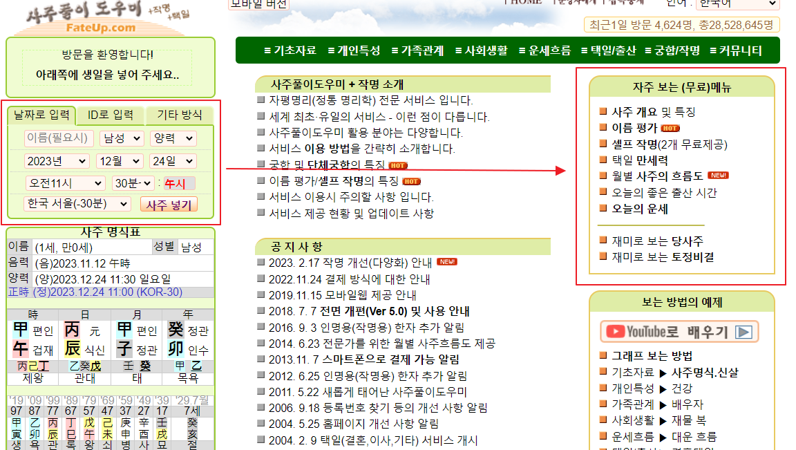 저는 보통 날짜로 입력 영역을 통해 로그인을합니다. 그러면 하단 사주 명식표에서 사주풀이가 되고 이를 통해 오른쪽 자주보는 무료 메뉴 사이트를 통해 내가 원하는 서비스를 이용할 수 있는 프로세스 입니다.
