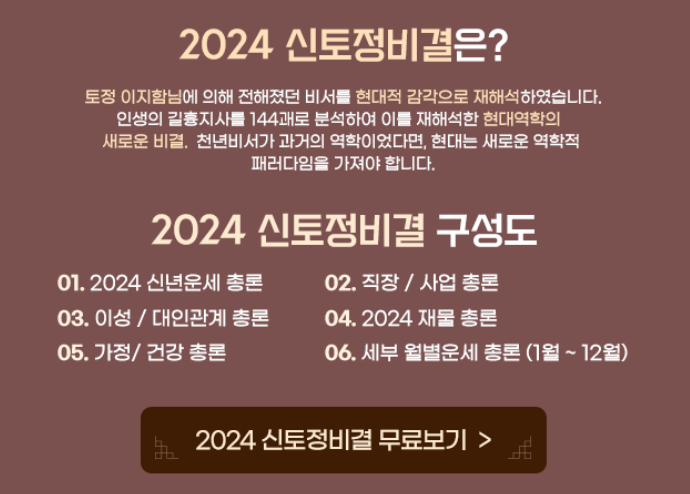 2024 신토정비결은 토정 이지함 선생으로 인해 전해져 온 괘를 재해석하여 풀어내었습니다.