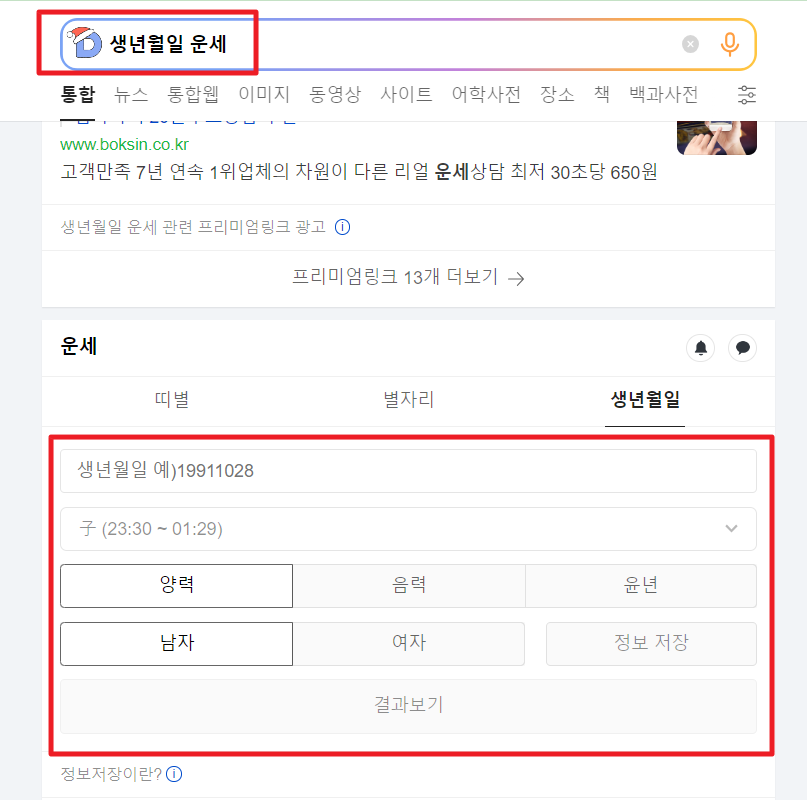 모바일로 이용하시는 분들이 많아 모바일 버전 다음 운세로 넘어갈 수 있도록 준비해보았는데요, 위 버튼을 클릭할 경우 아래와 같이 생년월일 운세 검색 결과 창이 나옵니다.