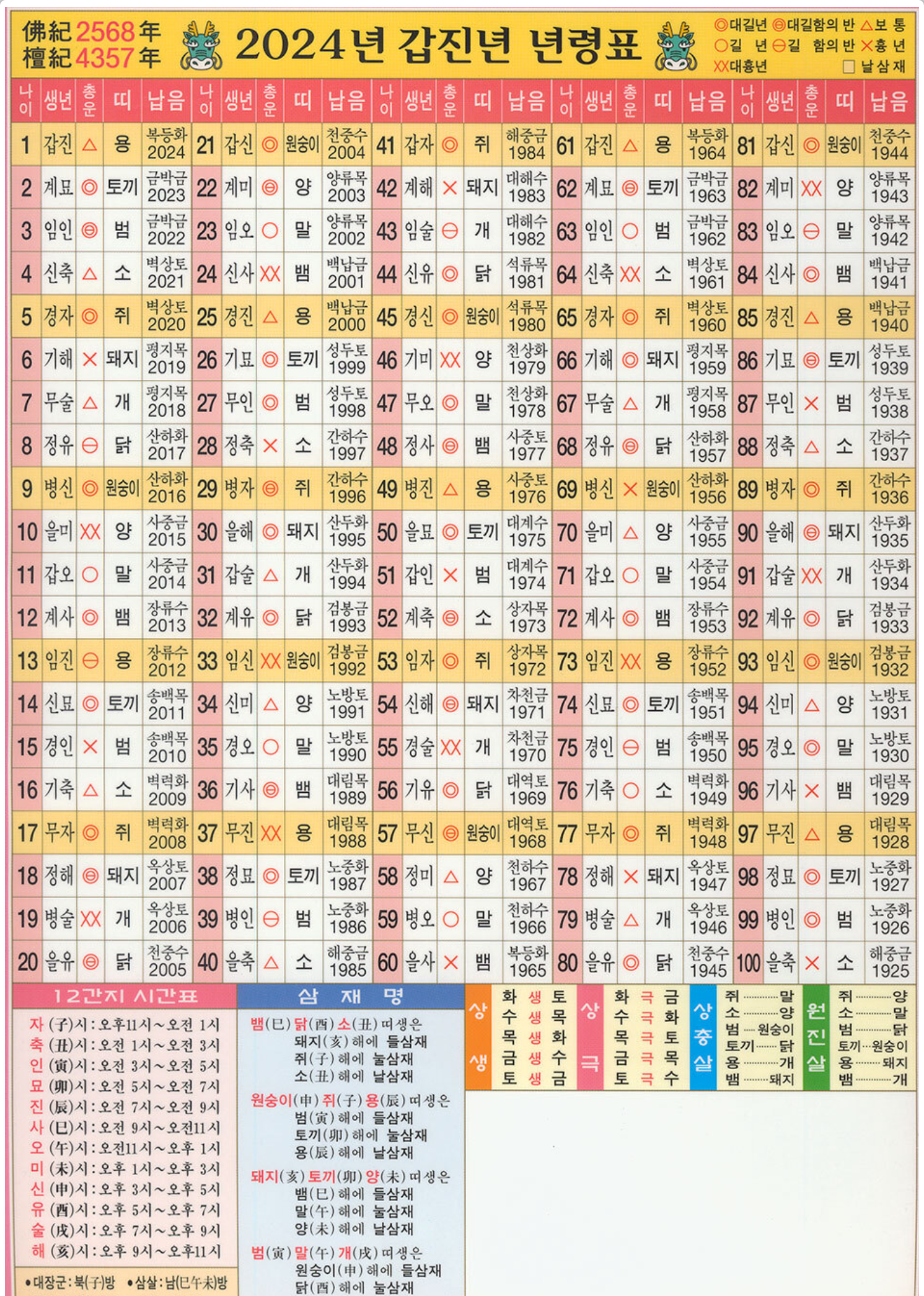 이 처럼 2024년 갑진년 연령표를 참고하시어 확인해볼 수 있습니다. 크게 클릭해서 확인하셔도 되고 아래 파일을 첨부해 드리오니 받아서 보셔도 됩니다.