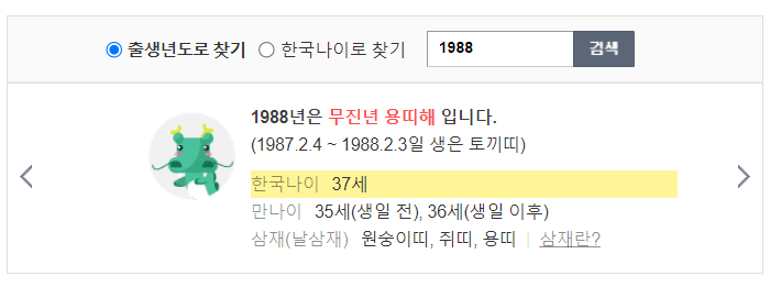 올해 용띠인 1988년생을 입력해 보았습니다. 1988년 2월 4일 이후에 태어난 사람은 용띠이며, 2월 3일 이전에 태어났을 경우에는 토끼띠로 확인되는 것을 알 수 있습니다.