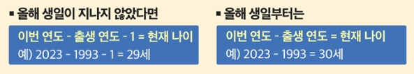 새해가 바뀌면 한 살을 먹는 한국식 나이와는 다르게 만나이 계산방법은 현재 2024년에서 생년월일을 빼주고 생일이지나지 않았다면 1을 더 빼주는 방식으로 계산하게 됩니다.