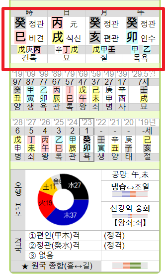 사주를 넣으면 아래와 같은 박스가 보이는데요, 빨간색 박스에서 년 / 월 / 일 / 시는 천간을 의미합니다. 이는 이상 즉, 마음이 향하는 곳을 일컫습니다. 아래 글자는 지지 즉 현재 나의 모습, 환경 등을 뜻합니다.
