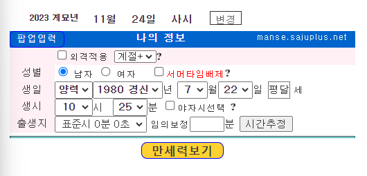 아래는 플러스 만세력 이라는 사이트로 쭉 내리다보면 만세력을 볼 수 있는데요 아래와 같이 나의 정보를 입력 한 다음 아래 만세력 보기 버튼을 클릭하시어 이용하시면 됩니다.