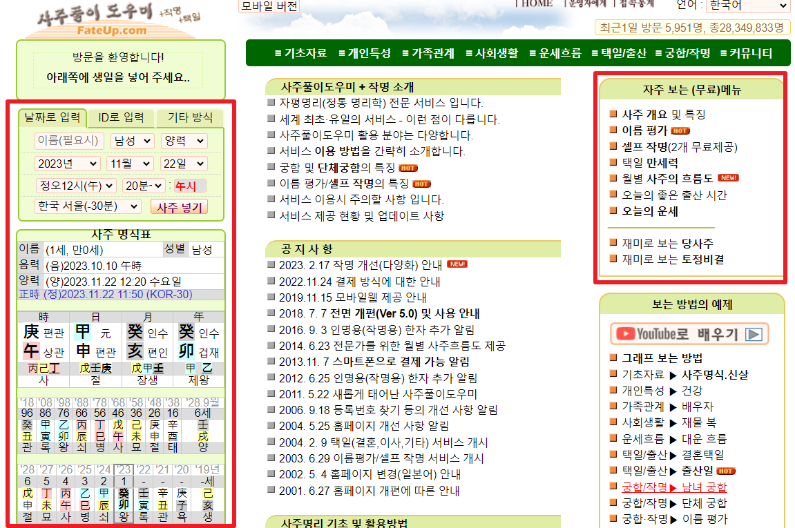 사주풀이 도우미 사이트에서 오른쪽 자주보는 (무료) 메뉴 페이지를 빨간색 박스로 색인해놓았는데요, 4번째 택일 만세력을 확인하시면 만세력을 확인해볼수 있습니다.