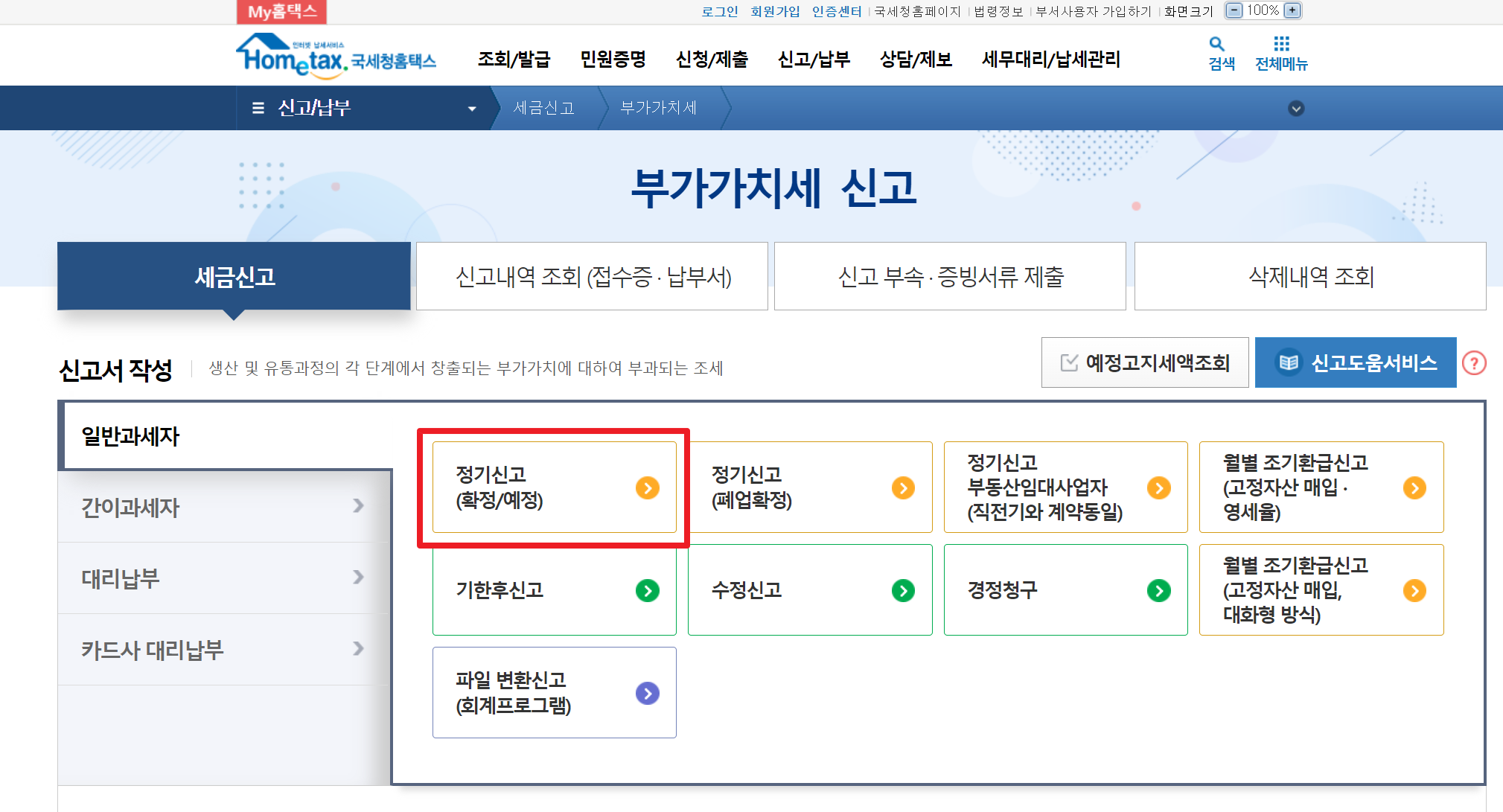 부가가치세 신고 페이지에서 일반과세자의 경우 아래와 같이 정기신고 박스를 클릭하시면 됩니다. 아래 간이과세자 등 신고대상이 구분되어있으니 이에 따라 진행하시면 됩니다.