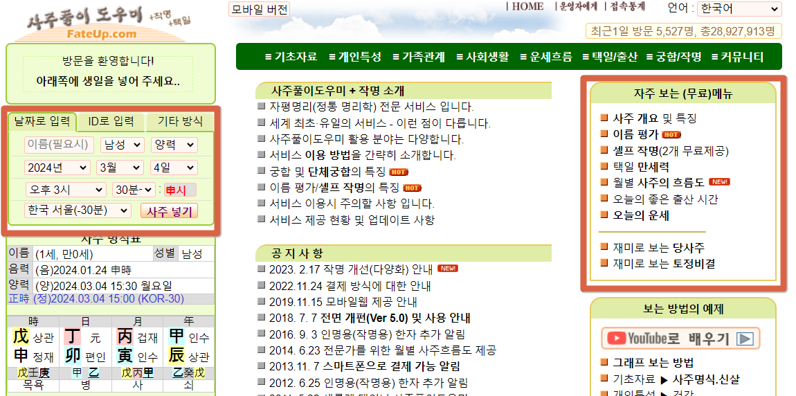 두 번째로 알려드리는 사주풀이 도우미 사이트는 저 또한 자주 이용하고 있는데요, 꽤 방문자수도 높고 많은 인기가 있는 사이트 중 하나 입니다.