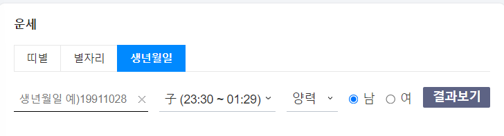 해당 운세 서비스는 다음에서 제공하고 있으나 실제로는 사주닷컴 사이트에서 제공하는 서비스 입니다. 아래와 같이 운세 란에 생년월일을 입력 후 태어난 시 등을 입력 후 결과보기를 클릭해보시기 바랍니다.