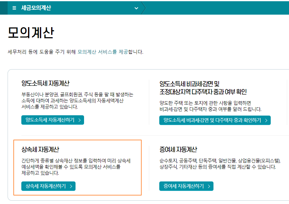 상속세를 위 버튼을 통해 직접계산해볼 수 있습니다. 미리 예상 세액을 확인해서 최대한 절세 받는 방법에 대해서 생각해야 하기 때문에 유용합니다.