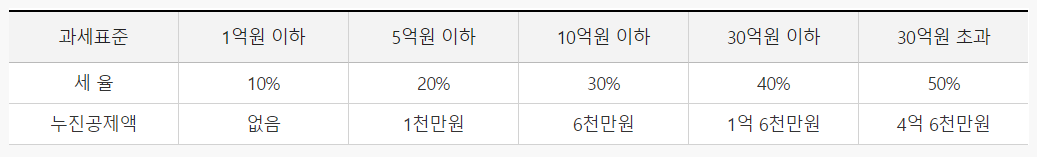 상속세율은 (상속세 과세표준 X 세율 ) - 누진공제액으로 계산합니다.