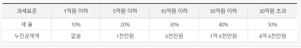 네 같은 것을 확인할 수 있는데요, 상속세율과 증여세율은 매겨지는 세율이 같습니다. 하지만 다른점이 당연히 있습니다. 상속세는 평생 한번만 발생하는 반면, 증여세는 10년 주기로 세금이 부과되기 때문입니다.
