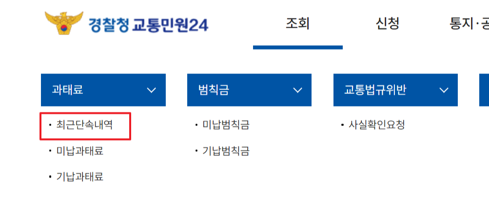 해당 사이트에서 [조회] ▶ [과태료] ▶ [최근 단속 내역]을 차례대로 이동하시면 됩니다. 아래 이미지를 참고하시어 확인해보시기 바랍니다.