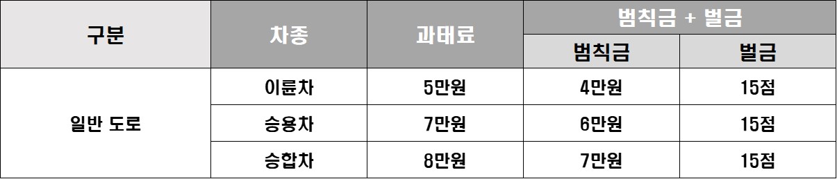 또한 일반도로일 경우 어린이보호구역보다는 좀 더 낮은 과태료와 범칙금을 확인할 수 있습니다.