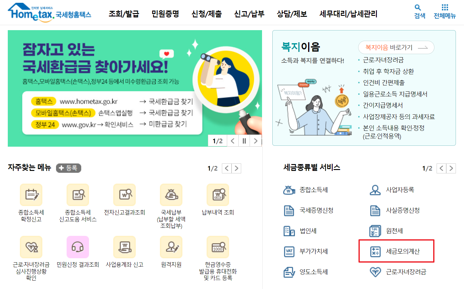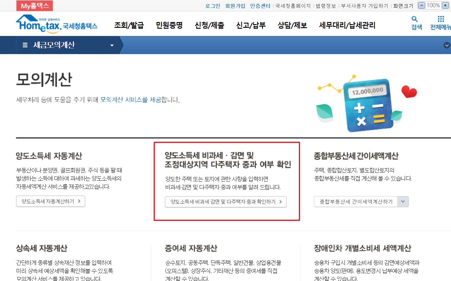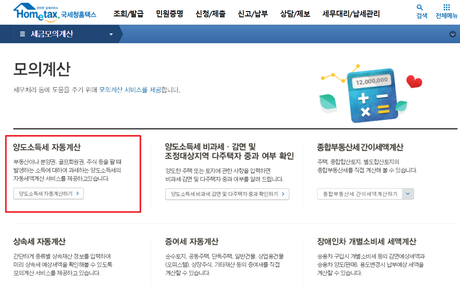 버튼 클릭시 홈택스에서 제공하는 세금 자동계산기를 이용할 수 있습니다. 아래 이미지 빨간색 영역을 따라가시면 양도소득세 계산기를 이용하실 수 있습니다.
