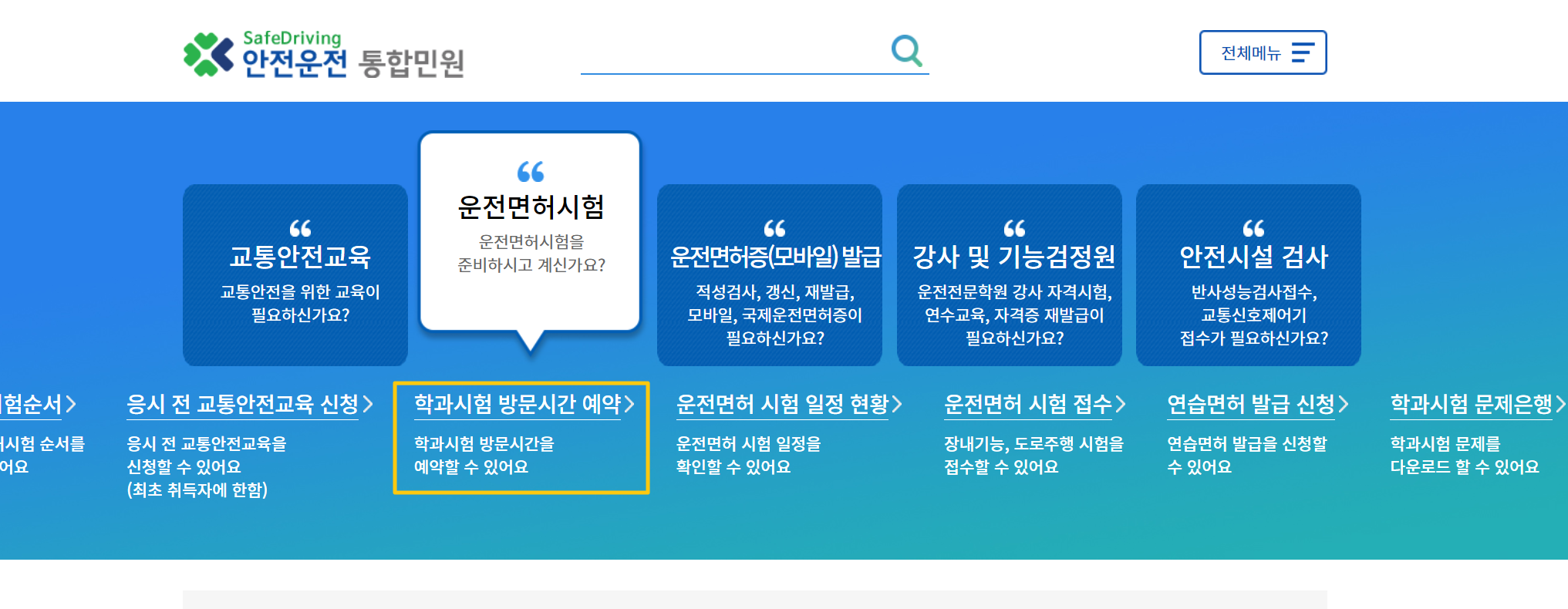 버튼 클릭 후 아래 홈페이지에서 '운전면허시험' 클릭 후 학과시험 방문시간 예약을 클릭하시면 절차에 따라 이동하시어 필기시험을 신청할 수 있습니다.