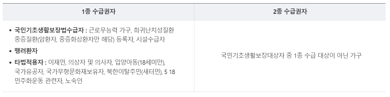 의료급여 수급권자는 1종과 2종으로 나뉘어집니다.