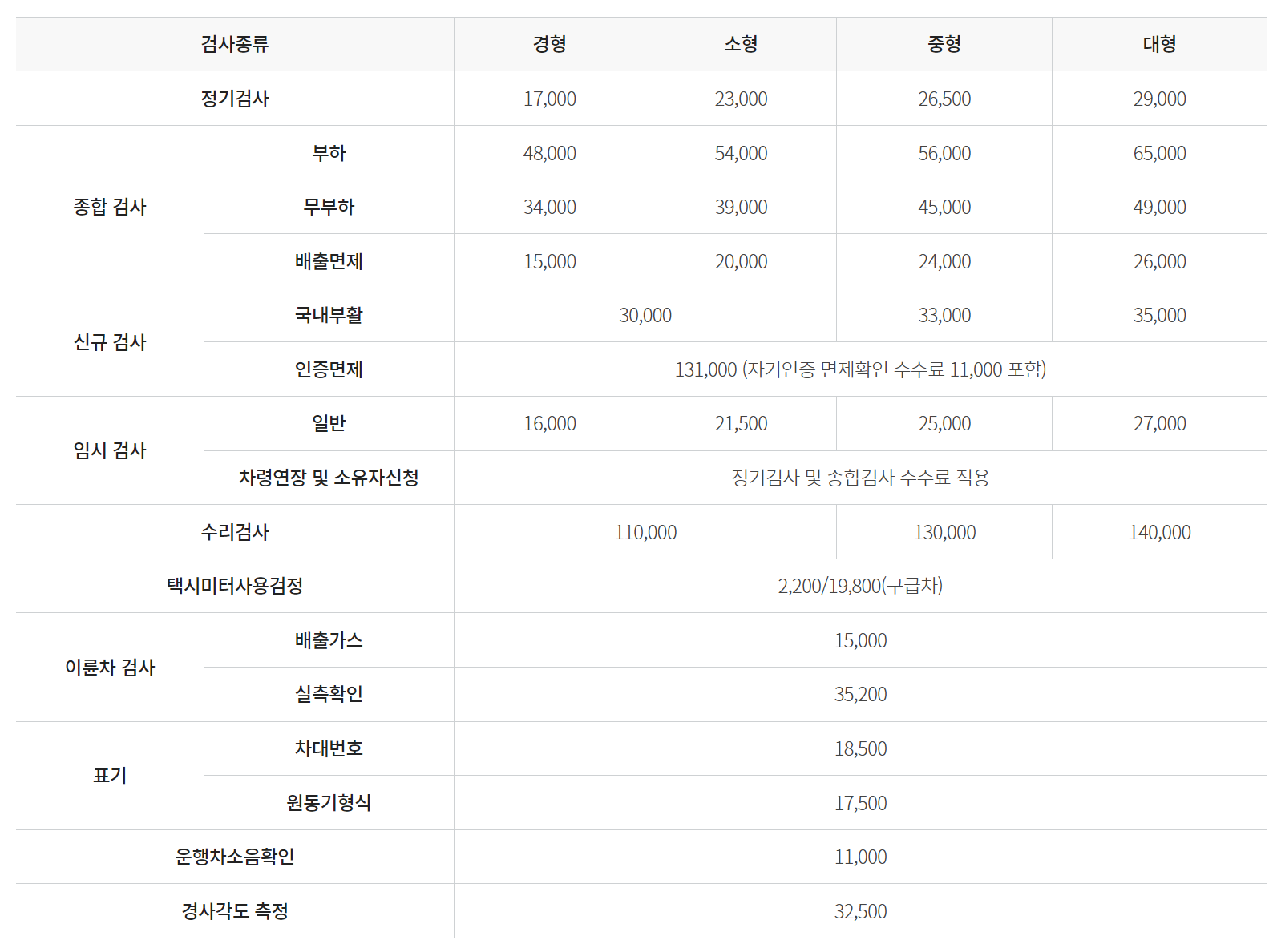 자동차 검사 수수료의 경우 부가세포함이며 재검사기간 내에 재검사 수수료는 면제됩니다. 내 차량이 경차라면 정기검사는 17,000원 가량되며 중형차라면 26,500원 가량입니다.