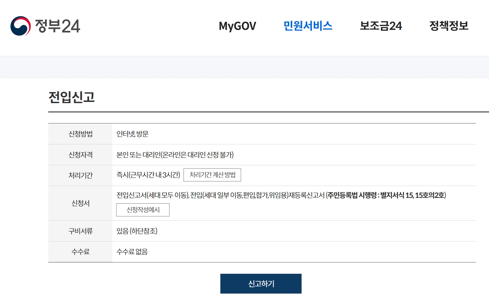 아래 이미지와 같은 페이지로 바로 이동되는데요, 온라인으로 전입신고를 할 경우에는 별다른 신분증 등을 준비하지 않으셔도됩니다.