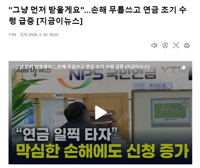 또한 국민연금을 조기수령하는 사람들이 갈 수록 늘고 있다는 뉴스 기사도 심심치 않게 살펴볼 수 있습니다.