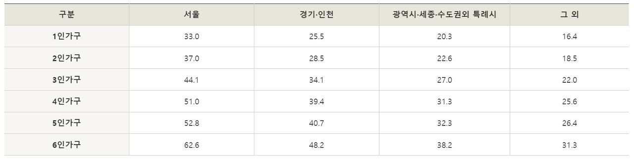 기준 중위소득 47% 이하인 가구라면 지원받을 수 있는데요 아래 표를 통해 우리 집 가구원 수에 따른 중위소득 47% 기준을 확인해보시기 바랍니다.