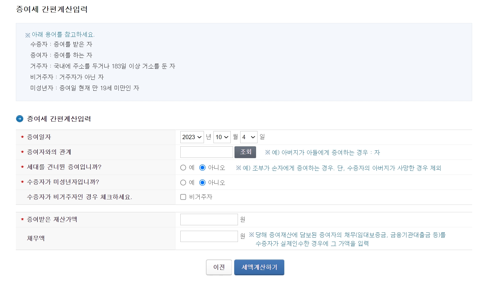증여일자, 증여자와의 관계, 수증자가 미성년자 임을 확인하는 항목은 면제한도액을 체크하기 위함이며, 이를 입력하시어 간편하게 증여세가 어느정도 나올지 미리 체크해볼 수 있습니다.