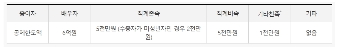 증여세 면제한도액은 배우자, 직계존속, 또는 직계비속, 기타 친족 등 가족 구성원에게 면제한도액이 각각 다르게 적용됩니다. 아래 증여세 면제한도액 표를 확인해보시기 바랍니다.