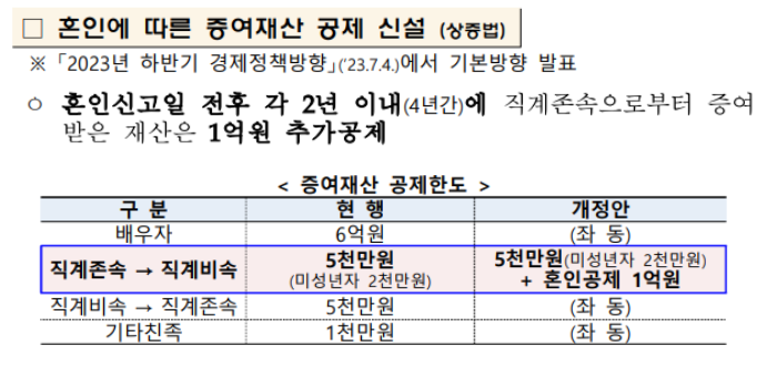 보통 혼인하는 자녀를 둔 부모의 경우 5천만원이 너무 적게 느껴질 수 있는데요, 2023년 최근 해당 면제한도액이 변경됨에 따라 면제한도액이 5천만원에서 1억 5천만원으로 변경되었습니다.