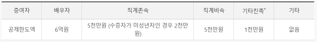 증여세 면제한도액은 수증자와의 관계에 따라 한도액이 각각 달라집니다.