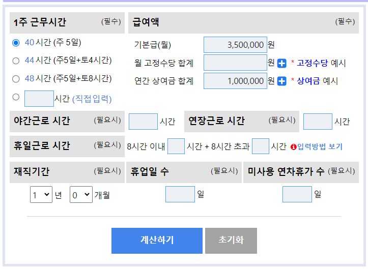 해당 계산기 역시 하루 8시간 근무하는 조건으로 계산해보았는데요 만약 추가 근무를 하는 분들은 시간을 직접 입력하셔도 무관합니다.