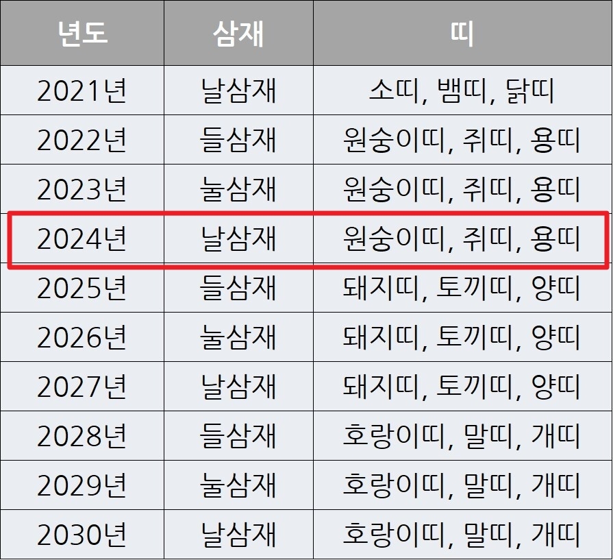 그렇다면 삼재띠는 어떻게될까요? 삼재띠는 보통 날삼재, 들삼재, 눌삼재 3가지로 구분됩니다. 아래 표를 통해 2024년 삼재띠를 알아보도록 하겠습니다.