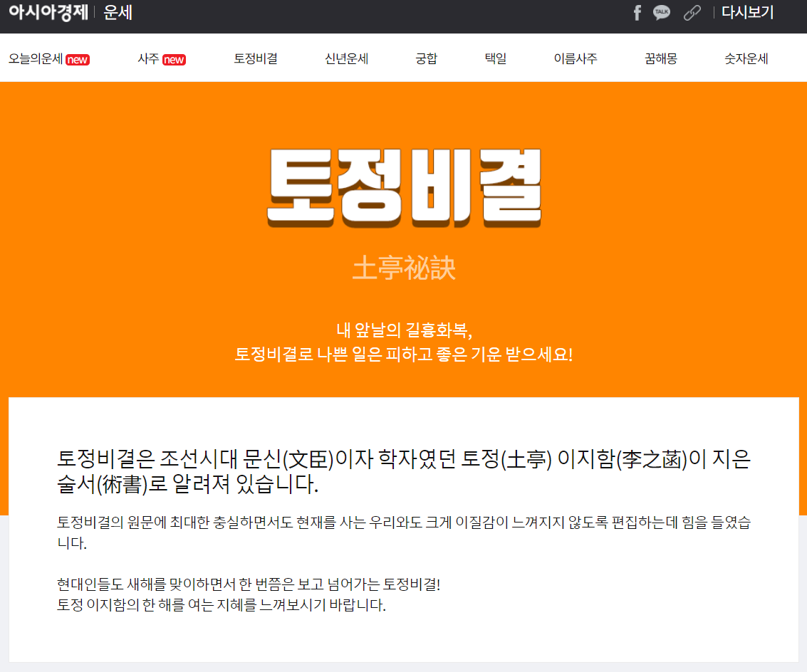 아시아경제 사이트에서도 토정비결을 확인할 수 있는데 무료 서비스라 많은 사람들에게 알려져 있습니다. 토정 이지함 선생의 술서로 새해를 맞이하면서 한번 확인해보시기 바랍니다.