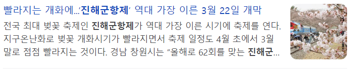 뉴스 기사에 따르면 기후 변화로 인해 올해 진해군항제는 3월 22일에 개막하여 역대 가장 빠르게 축제가 개최될 예정입니다.