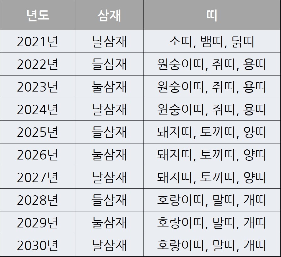 2025년은 들삼재로 돼지띠, 토끼띠, 양띠입니다. 2025년 들삼재에 해당하시는 분들은 위 표를 통해 확인해보시겠지만 2025년부터 2026년과 2027년까지 3년동안 삼재띠에 해당합니다.