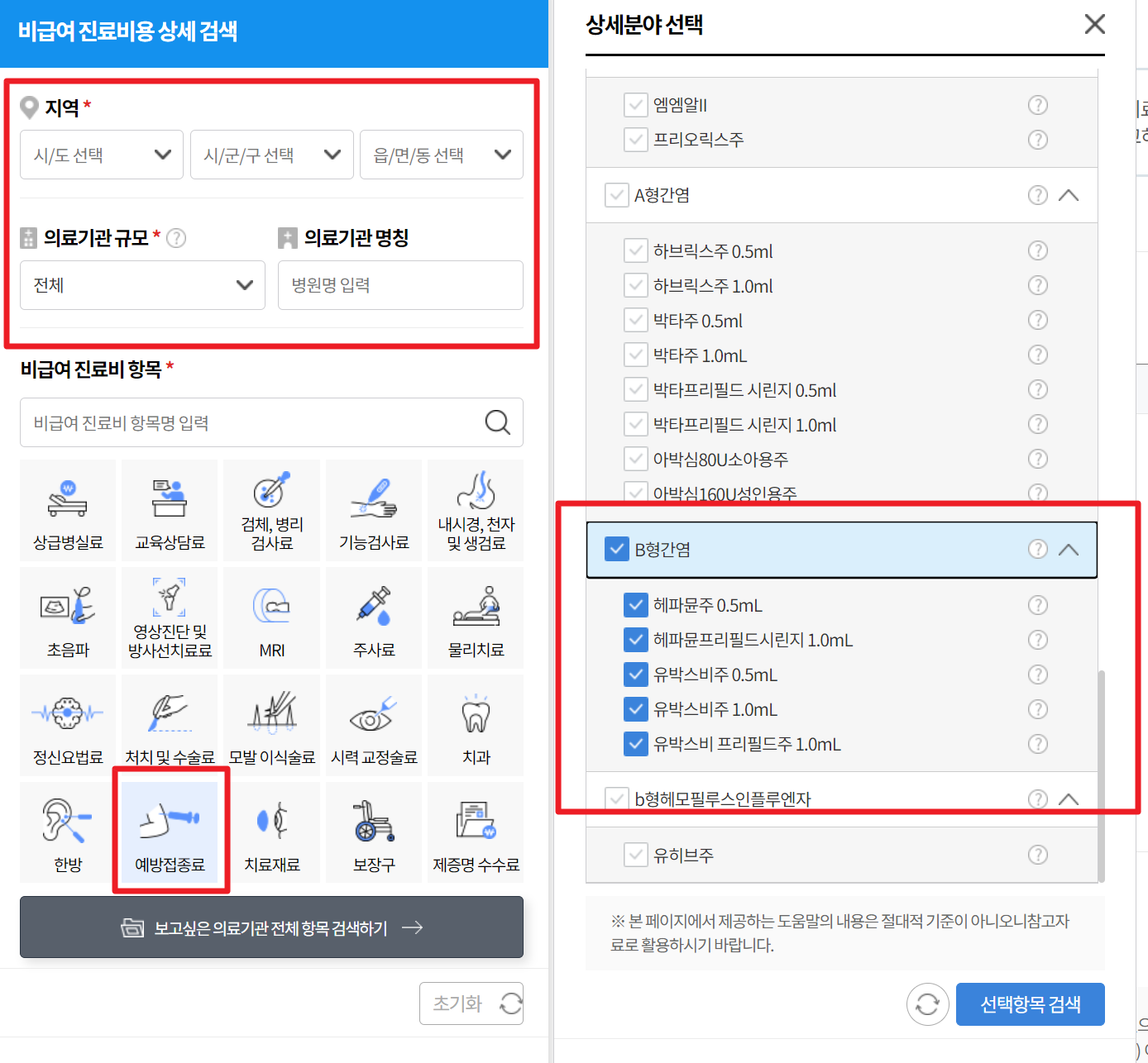 B형간염은 비급여 항목으로 예방접종 시 비용이 청구됩니다. 위 버튼을 클릭시 비급여 진료비용을 검색할 수 있는데요, 빨간색 박스를 모두 입력 및 체크 후 B형간염 예방접종 비용을 검색 후 내원하시기 바랍니다.
