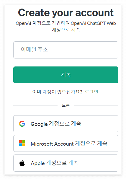 말 그대로 Open ai 계정을 만들 수 있는 이메일 주소를 입력하면 되는데요 우리는 보통 구글 계정을 하나씩은 갖고 있기 때문에 [Google 계정으로 계속] 버튼을 클릭해 바로 Chat GPT를 실행할 수 있습니다.